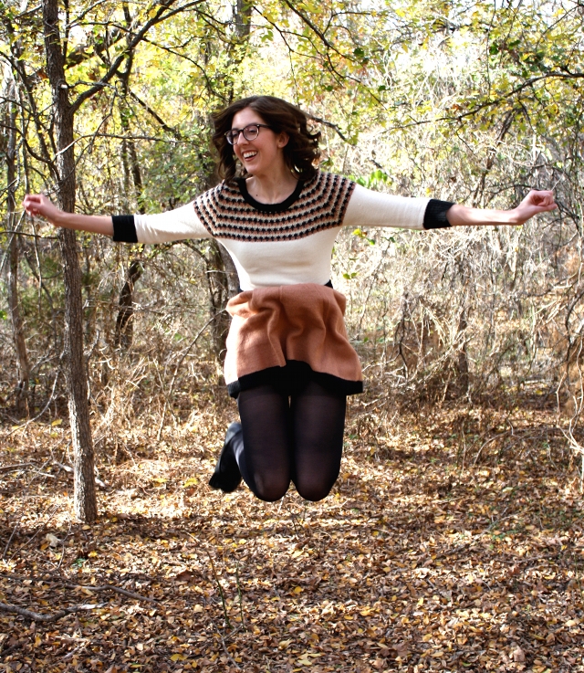 After I got over the initial awkwardness, I really had a lot of fun! I even tried a jumping picture like Kaylah does so beautifully. That is my "I'm so happy it's Christmas break and I survived final exams" face. Overall, it was a lot of fun. I got to jump around in the woods wearing my new, end of semester treat to me. I'll take frolicking in the leaves over flipping through flash cards any day. ;-)